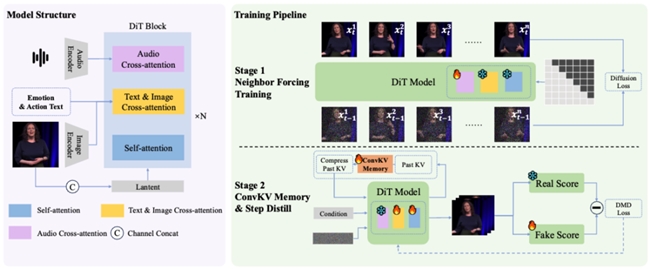 为提升长序列稳定性,SoulX-LiveAct引入RoPE Reset机制,对位置编码进行周期性对齐,避免因序列增长带来的位置漂移问题。在训练阶段,模型不仅采用Neighbor Forcing对齐训练分布,还通过构造长序列chunk训练样本,使模型能够在训练过程中直接面对误差累积与纠正过程。同时,引入与推理阶段一致的Memory-Aware训练方式,使模型在压缩记忆条件下仍能保持稳定表现,从源头减少训练与推理不一致带来的性能波动。