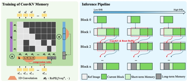 与此同时,ConvKV Memory机制对传统注意力机制中的KV缓存进行了结构性优化。该机制将历史信息划分为“短期高精度窗口”与“长期压缩记忆”两部分:前者用于保证局部细节与一致性,后者通过轻量化卷积进行压缩,以固定长度表示历史信息。