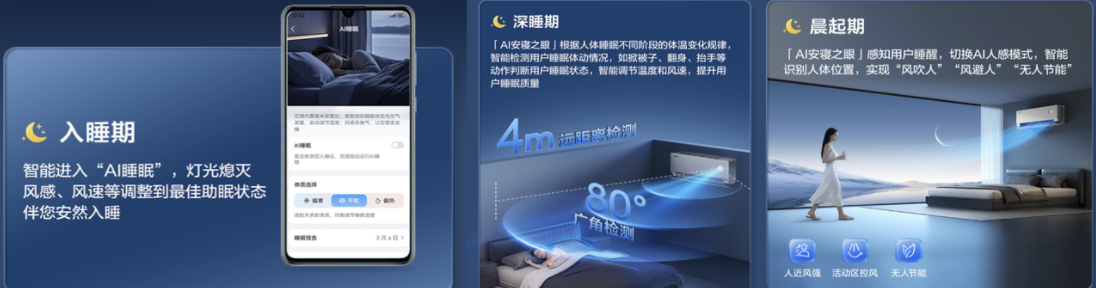 这一能力使空调首次实现了对睡眠阶段的实时感知:当用户晚上准备睡觉时,开启"AI睡眠"模式,空调灯光、风感、风速会自动调到最舒服的助眠状态。