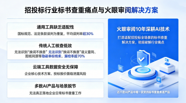 正是在这样的行业背景下,火眼审阅深耕招投标领域10年,以 AI 技术为核心,打造了真正适配招投标全场景的标书查重解决方案,彻底破解了行业长期存在的痛点。这也是其能在近千款 AI 产品中突围,成为本次大赛标书查重赛道获奖产品的核心原因。
