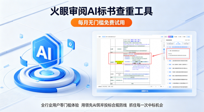 目前,火眼审阅已开放每月无门槛免费试用额度,全行业用户均可零门槛体验这款获奖的专业 AI 标书查重工具,用先进的 AI 技术,筑牢投标合规防线,抓住每一次中标机会。