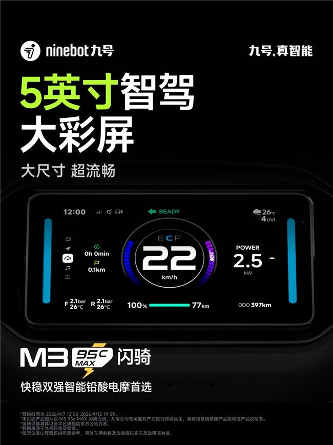 4月14日,九号 M3 95c MAX 闪骑与 M3 85c MAX 闪骑正式上市开售,首发价分别为6299 元起和4799 元起。作为九号闪骑系列新品,两款车型围绕快与稳双重强化,成为同价位的“快稳双强智能铅酸电摩首选”。