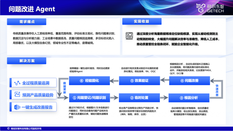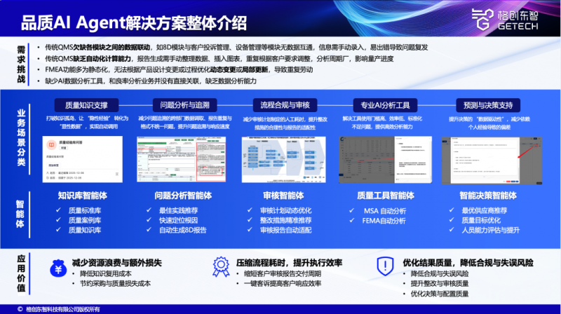 格创东智品质管理AI Agent解决方案,借助AI技术、丰富的行业Know-How,对产品质量进行全方位智能把控,从原材料采购到生产过程,再到成品检验,实现全流程的质量管控。它将章鱼智脑的仿生架构下沉到质量域,构建了一个由多智能体协同的品质决策中枢,以一个能够主动感知异常、自主分析根因、自动执行改善任务的包括质量经验库智能体、问题分析智能体、智能决策智能体、FMEA Agent、审核智能体、8D报告生成智能体、质量工具智能体在内的智能体集群,通过精准的数据分析和智能决策,有效降低次品率,提升产品整体质量,为企业带来显著的经济效益和市场竞争力。