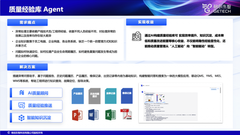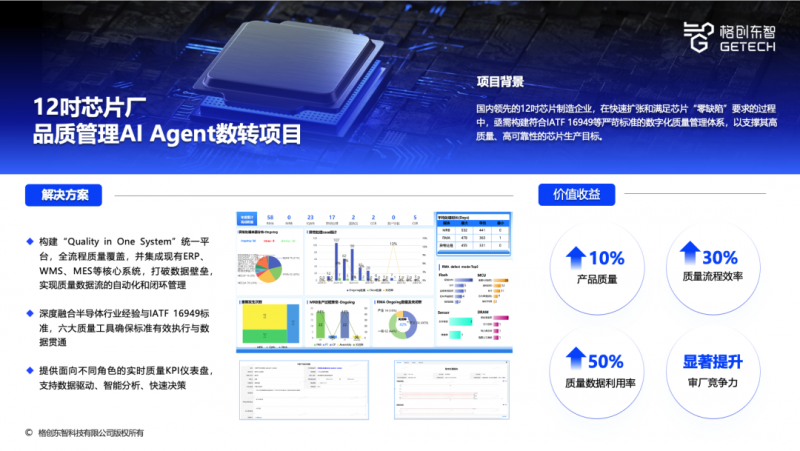 以半导体行业为例,某国内先进的12吋芯片制造企业,在客户“零缺陷”要求和资深工程师流失的双重压力下,传统QMS难以为继。格创东智为其交付品质管理AI Agent方案。上线后,质量数据利用率提升50%,工程师质量流程效率提升30%,团队开始将精力转向工艺窗口优化和缺陷预防。更关键的是,该系统支撑显著提升该企业审厂竞争力,成为其拿下新订单的加分项。