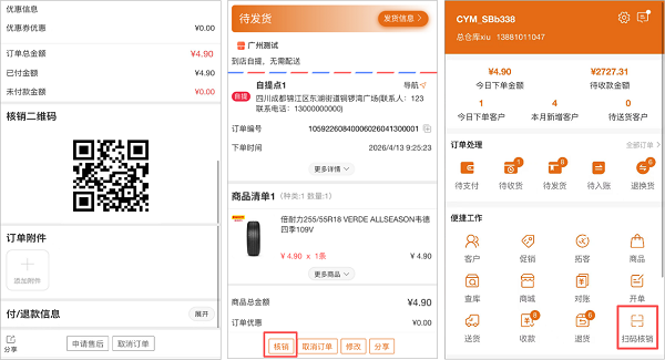 快马数字轮胎行业版上门自提扫码核销部分应用界面截图