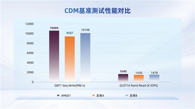 在CDM基准测试中,AM6D1实现了顺序读写10.7/10.6GB/s(1TB)、随机读写1500/1150K IOPS(1TB)的标称性能,并在关键指标上明显优于友商。其中,Q8T1顺序写性能达10684MB/s,友商A与友商B同类PCIe 5.0产品分别为9507MB/s和10198MB/s;Q32T16随机读性能达1640K IOPS,显著超越友商A的1430K IOPS及友商B的1470K IOPS。