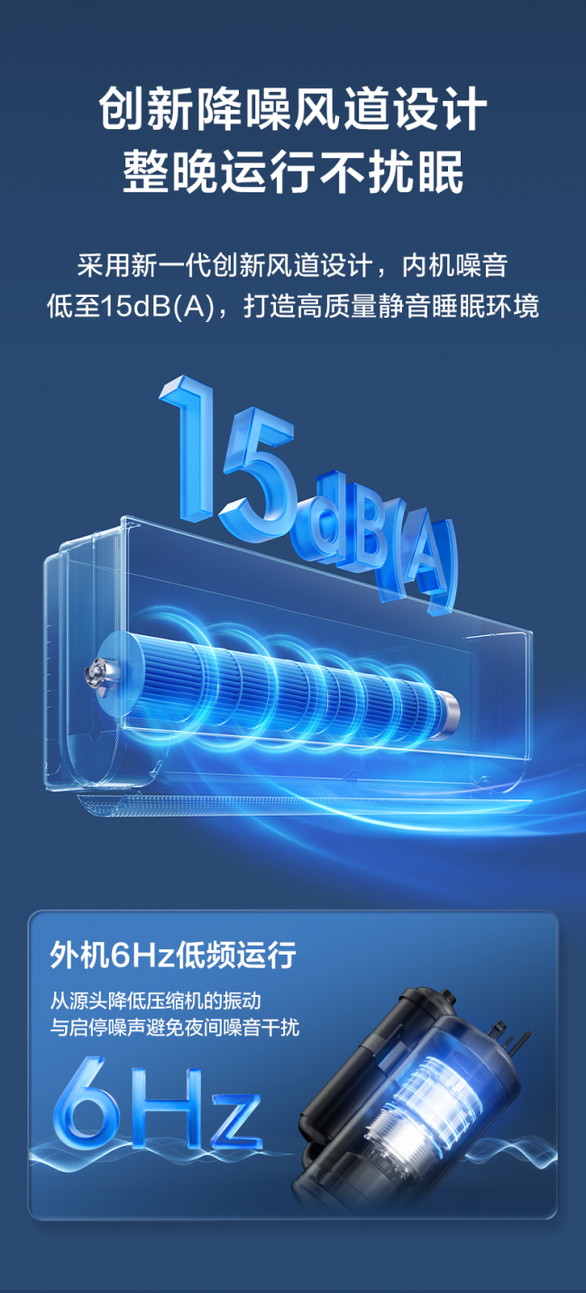 静音方面,它采用新一代创新风道设计,通过优化风道结构、降低气流湍流与机械振动,将内机噪音控制在15分贝,比轻声耳语更柔和,堪比人体呼吸声,整晚运行几乎无存在感,彻底解决噪音扰眠痛点。