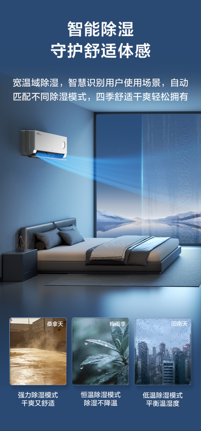 针对不同季节痛点,它配备AI恒温除霜技术,采用高效薄霜速溶控制算法,解决冬季外机频繁结霜导致的忽冷忽热问题;智能除湿功能可自动识别梅雨季、回南天等特殊场景,实现只除湿不降温,确保卧室四季干爽。