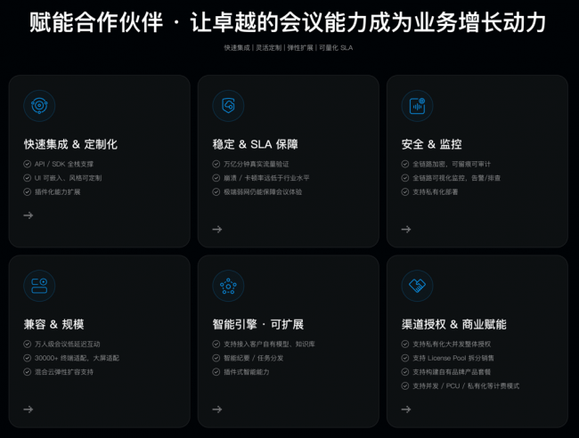 除了国央企、金融企业、民企等政企客户外,声网智能云会议引擎也与会畅等多个会议合作伙伴建立合作。声网会议引擎的“快速集成”、“灵活定制”、“弹性扩展”、“插件式 AI 能力”等会议能力均可以赋能给会议合作伙伴,与其会议系统/平台深度结合,不仅为客户带来卓越的会议体验,也为合作伙伴的业务带来增长动力。