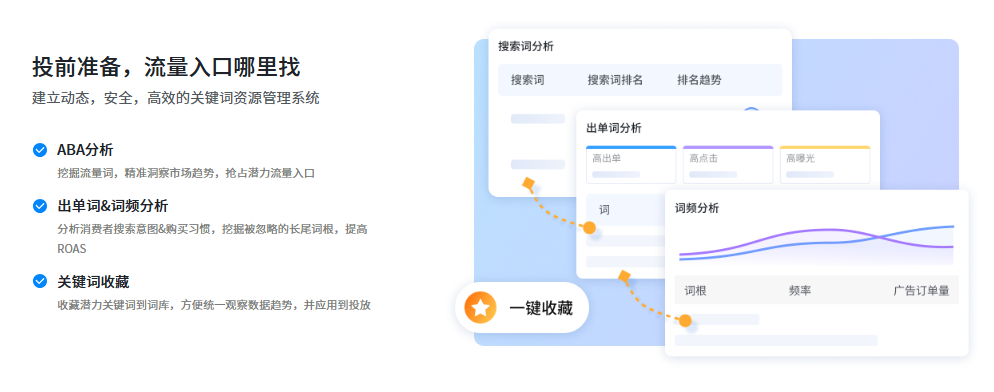 关键词收藏与管理:支持将潜力关键词统一收藏至词库,便于持续观察数据趋势,并一键应用到广告投放中。