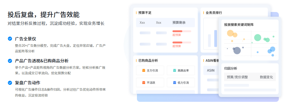 广告全景仪:整合20+广告数据分析模型,从大盘到单个产品矩阵,多维度透视广告表现,快速定位异常店铺或广告活动。