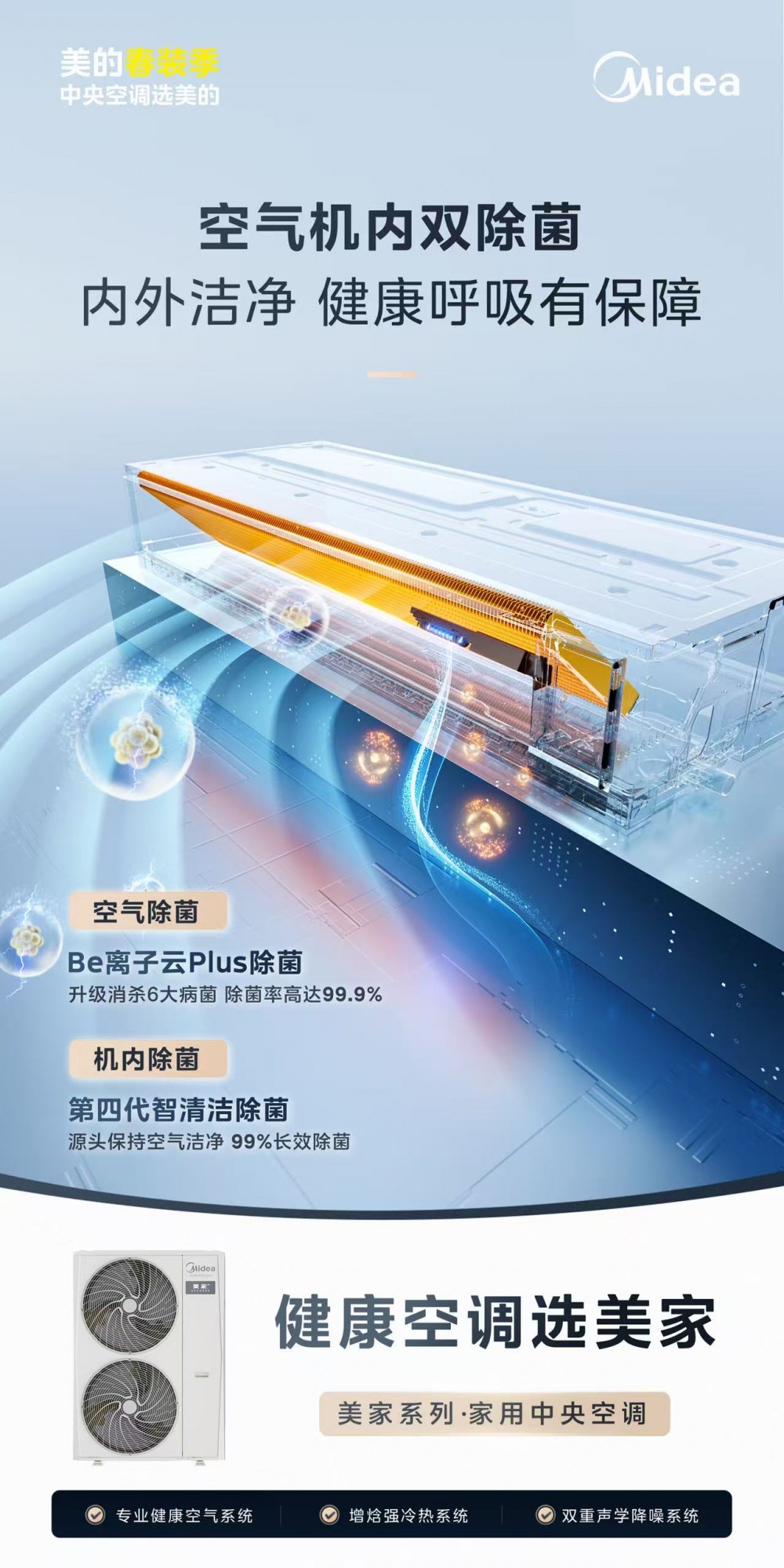 美享家支持全屋家电一屏联动,下单即送智能语音全彩触控屏。无论调节温度、切换模式,还是联动新风、加湿,一句话的事。从此,中央空调不再是孤立的设备,而是全屋空气的智能入口。美享家还搭载Be离子云Plus除菌技术。同时内机采用第四代智清洁技术,56℃高温蒸汽深度自清洁,去除翅片上的灰尘、病毒和细菌。从全屋空气到空调内部,双重防线让母婴家庭、敏感人群也能安心呼吸。