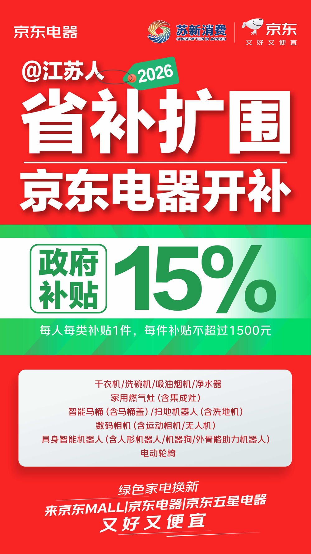 根据江苏省商务厅发布的《关于实施江苏省2026年消费品以旧换新地方自主品类补贴政策的通告》,在2026年国补10大品类的基础上,新增10大类进行江苏省自主补贴,包括干衣机、洗碗机、吸油烟机、家用燃气灶(含集成灶)、净水器、智能马桶(含马桶盖)等智能家居产品(含适老化家居产品);扫地机器人(含洗地机)、数码相机(含运动相机、无人机)、具身智能机器人(含人形机器人、机器狗、外骨骼助力机器人)等“人工智能+”新一代智能终端;以及电动轮椅。消费者购买上述品类商品,可享受扣除各环节优惠后最终销售价格的15%的补贴,每人每类可补贴1件,每件补贴最高不超过1500元。新增商品须具有统一国标13位商品编码,其中有能效或水效标识的,须为中国能效或水效标识1级且已在能效或水效标识网备案。补贴政策至2026年12月31日结束,限额管理,用完即止。