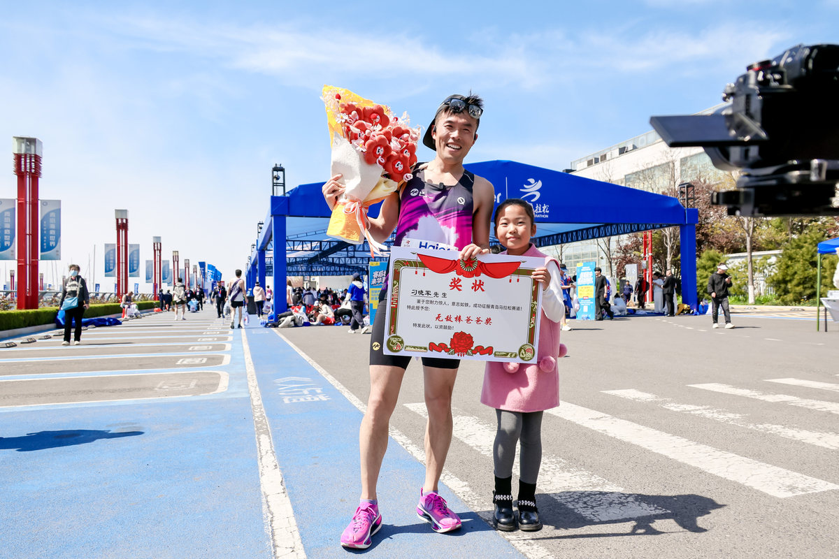 4月19日,在海尔·2026青岛马拉松现场,小刁老师刚结束全马赛程,等候在外的8岁女儿便迎了上来。她双手捧着小红花和“最棒爸爸”奖状,轻轻递到他的手中,并仰着脸不停夸赞着爸爸,成就了本届青马温馨动人的一幕。