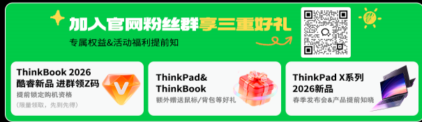 想要拿到更多一手资讯,解锁更多专属福利?加入联想官网粉丝群就能搞定!进群就能解锁三重专属好礼:不仅能领取专属 Z 码,提前锁定 ThinkBook 2026 酷睿新品的购机资格,不用再为抢货焦虑;购买 ThinkPad&ThinkBook 产品,还能额外获赠鼠标、背包等实用配件,为你的移动办公配齐装备;更能提前知晓 ThinkPad X 系列新品发布会的一手资讯,和同好一起交流,提前解锁科技新体验。