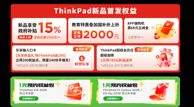 从量身打造的新品,到诚意满满的福利,本次 ThinkPad 2026 新品暨天禧 AI 生态发布活动,就是要为每一个用户,带来适配你的 AI 生产力新体验。想要解锁全部专属权益,抢先入手心仪的新品,即刻点击 https://activity.lenovo.com.cn/smb/thinkxp-c.html 进入联想官网平台参与本次活动,开启你的 AI 办公新旅程!