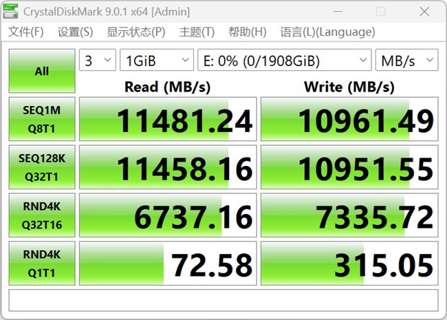 首先从基准测试来看,凭借采用高性能PCIe 5.0 4通道DRAMLess主控、3D堆叠TLC闪存颗粒,忆联AM6D1 PCIe 5.0固态硬盘2TB的确有非常不错的表现。在CrystalDiskMark测试中,它的顺序读取速度突破了11400MB/s的标称规格,测试成绩为11481.24MB/s。其顺序写入速度则达到10961.49MB/s,也超过了10900MB/s的标称顺序写入速度,相比PCIe 4.0 SSD的确有很大的提升。