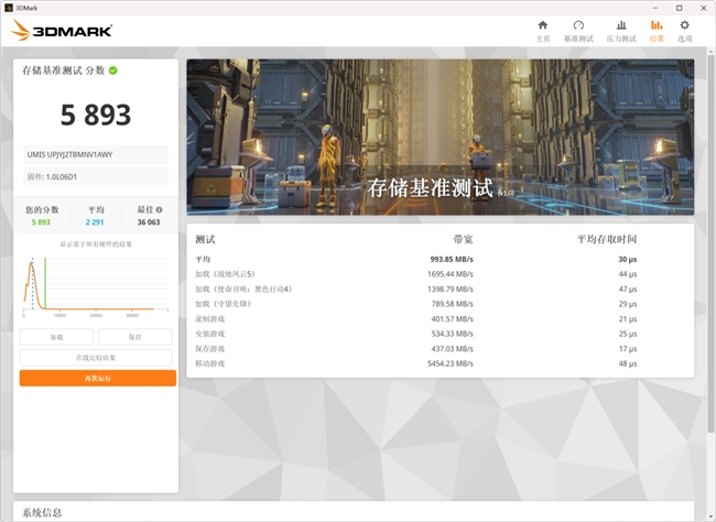 图注:忆联AM6D1 PCIe 5.0固态硬盘2TB的3DMark存储性能测试高达5893分