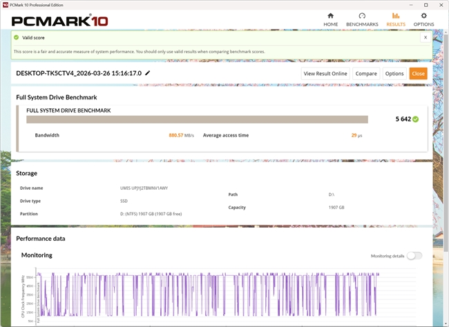 而忆联AM6D1 PCIe 5.0固态硬盘2TB的PCMark 10完整系统盘测试总分高达5642,平均传输带宽为880.57MB/s,优于不少同样基于PCIe 5.0 DRAMLess主控的PCIe 5.0固态硬盘,以及高端PCIe 4.0固态硬盘。在我们的测试中,后面两类产品的得分大多在4900~5200分之间。