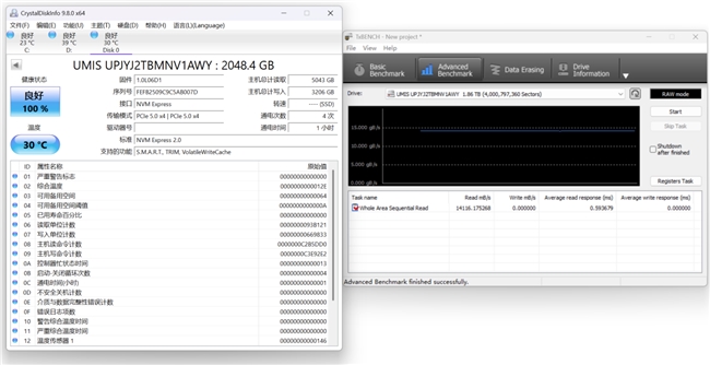 图注:忆联AM6D1 PCIe 5.0固态硬盘2TB的全盘平均顺序读取速度可达14116.17MB/s,读取完2TB数据时的温度仅30℃。
