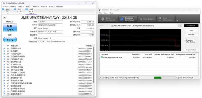 那么忆联AM6D1 PCIe 5.0固态硬盘在长期使用,进行超大容量数据的表现如何呢?我们使用Txbench进行了全盘读写测试。首先在全盘顺序读取测试中,SSD轻松地完成了任务,全盘平均顺序读取速度高达14116.17MB/s,远超标称的11400MB/s顺序读取速度。全盘顺序写入测试中,我们发现AM6D1 PCIe 5.0固态硬盘2TB的SLC缓存容量较大,SLC固定容量缓存设置在574GB左右。在这个容量范围内写入,其写入速度能保持在10900MB/s~11000MB/s。
