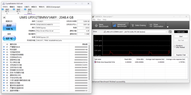 图注:忆联AM6D1 PCIe 5.0固态硬盘2TB的全盘平均顺序写入速度可达2208.65MB/s,写入2TB数据后的温度为57℃。