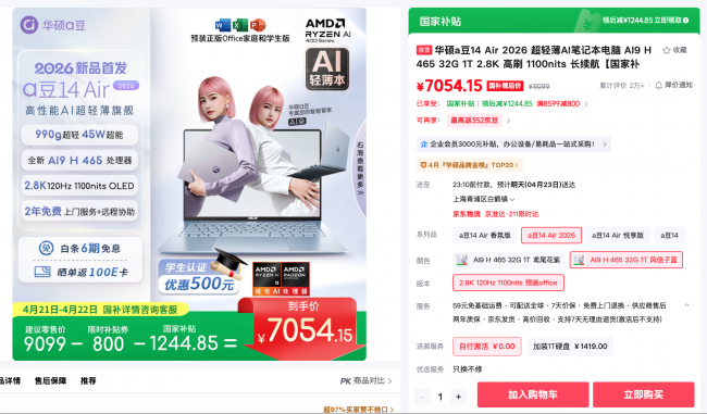 春招季,应届毕业生即将迈入职场全新征程。锐龙 AI,释放AI PC超能力,应对全新工作挑战,焕新生产力装备首推华硕a豆14 Air 2026,配备AMD 锐龙 AI 9 H 465 移动处理器,990g超轻薄美学机身带来45W超强性能,满足随时随地高效办公需求。此外,它还拥有2.8K OLED华硕好屏、豆叮AI助手等配置,带来更卓越的视野,更强劲的AI体验,全方位支撑职场新人从容应对影视后期、创意设计等高负载工作。当前购机,支持白条6期免息、晒单返100E卡福利,叠加至高1199.85元国家补贴,到手6799.15元。