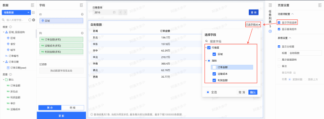 • 智能搜索与关联高亮:用户点击或圈选图表中的某个数据点(如“华东地区”),所有关联图表会自动高亮与该值相关的数据,灰色显示无关数据,帮助用户快速发现隐藏关联。