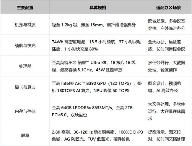 核心参数:机身轻至1.2kg起,薄至15mm,采用碳纤维增强机身。轻薄机身解决了职场人移动办公的核心痛点——携带不便。对于频繁跨城差旅、多会议室穿梭、户外临时办公的人群而言,1.2kg的轻量化设计,放入通勤包、公文包即可轻松携带,无需额外背负负担;15mm的纤薄机身,即便手持也不会有厚重感,搭配碳纤维增强材质,兼顾机身强度与轻盈质感,既能应对差旅途中的轻微碰撞,又能以利落的商务外观适配各类正式场合。无论是机场候机时的临时文档处理,还是咖啡馆的专注创作,亦或是会议室间的快速切换,这台轻薄本都能让你从容应对。