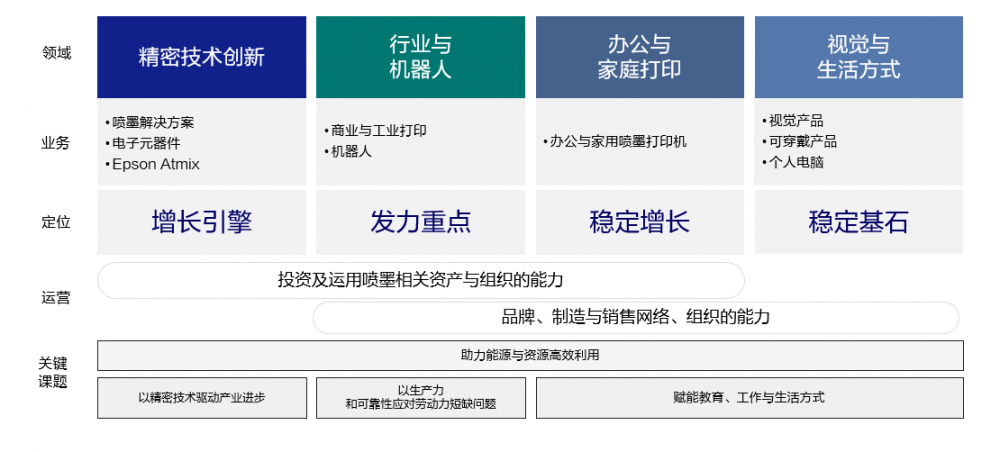 基于企业愿景,爱普生将致力于在四大领域创造长期价值:促进能源与资源的高效利用,以精密技术驱动产业进步,以生产力与可靠性应对劳动力短缺,以及赋能人们的教育、工作与生活。