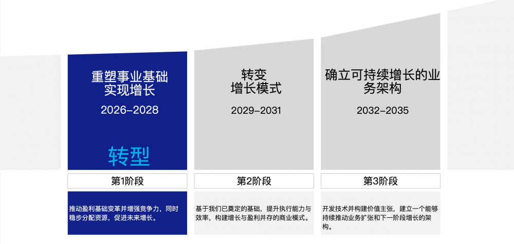 为确保长期企业愿景稳步落地,爱普生将十年发展规划拆解为三个循序渐进的阶段。2026 至 2028 财年为第一阶段,重点推进面向未来增长的业务根基变革与体系构建;2029 至 2031 财年为第二阶段,将在第一阶段搭建的坚实基础上,加速并全面完成向全新增长模式的转型;2032 至 2035 财年为第三阶段,最终确立能够持续创造价值、实现稳健增长的成熟业务结构。