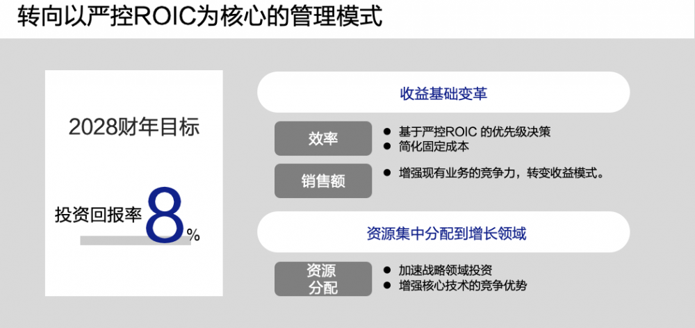 第一阶段是长期企业愿景落地的关键开局,“转型”成为核心关键词。截至目前,爱普生的业务结构高度依赖成熟市场,在第一阶段,爱普生将直面此前资源配置、资本效率等挑战,转型盈利基础,并将资源重点投向增长领域。以ROIC为核心管理指标,爱普生力争在 2028 财年实现 8% 的投资回报率目标,为可持续增长奠定坚实基础。