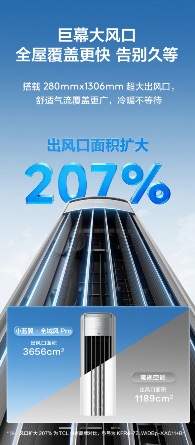 真正的冠军从不满足于单项突破,而是追求全方位的卓越。TCL小蓝翼·全域风Pro AI健康舒适空调拥有行业最大风口,以280mm×1306mm巨幕大风口,将出风口面积扩大207%,配合1860m³/h大风量与7620W大冷量,实现远距离覆盖全屋角落。TCL小蓝翼·全域风Pro AI健康舒适空调可一键开启"全域风"模式,自由选择环抱风、远距送风、全域柔风多种送风体验,全屋均匀送风,让每位家人无论在客厅的哪个位置,都能享受舒适体感。