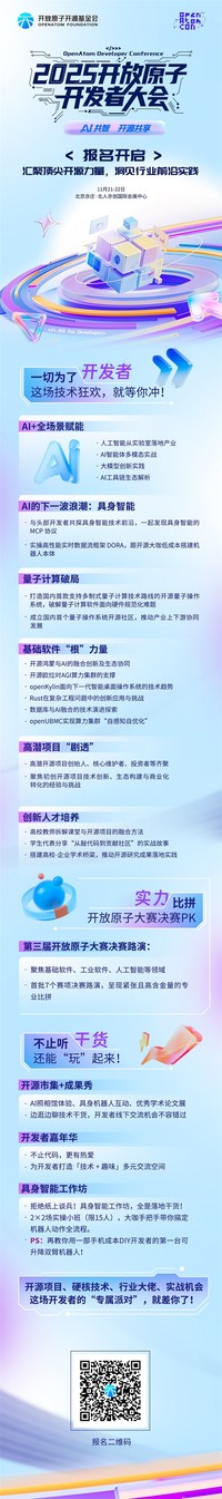 2025年11月21日至22日,2025开放原子开发者大会将在北京亦庄·北人亦创国际会展中心隆重举行。本届大会以“AI共治,开源共享”为主题,由开放原子开源基金会主办,汇聚全球顶尖开发者、企业技术领袖、社区核心贡献者与高校科研力量,通过主题演讲、分论坛技术演讲、赛事路演、互动展示等多元形式,打造一个引领技术潮流、激发学术碰撞、凝聚开源社区智慧的开源技术交流平台。