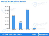 腾讯移动安全实验室最新发布了截至今年四月底的《2014手机安全用户研究报告》,报告显示在手机支付类病毒的染毒性别中,女性占比50.37%%,男性占比49.63%%。在支付类病毒的感染用户人群中,占比最大的人群是22~45岁的群体,占比达到50.41%%。值得关注的是,18岁以下的用户群体,感染手机支付占比达到31.71%%。