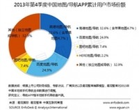 近日,易观智库发布了《2013年第4季度中国手机地图导航APP市场季度监测报告》,报告显示截至2013年第4季度,高德地图导航以32.6%%的市场份额继续领跑整个手机地图导航市场,这也是高德地图导航持续多个季度稳居市场龙头的位置。截止目前,高德地图导航应用下载装机激活总数已经超过3亿。